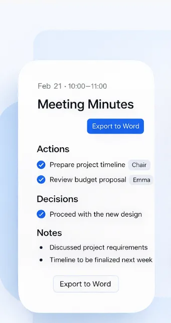 Capture decisions, actions, and responsibilities in a consistent format, then export professional minutes for circulation, records, or audit purposes — without changing how meetings are scheduled or run.