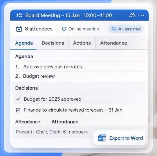Capture decisions, actions, and attendance in Outlook and export a clean Word record in one click.