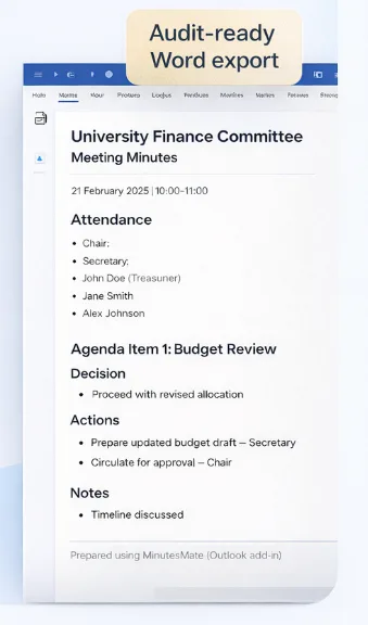 MinutesMate helps board, committee, and council admins turn meetings into structured minutes: decisions, actions, owners, and due dates—then export a polished Word record in one click. Works inside Outlook (no Teams).